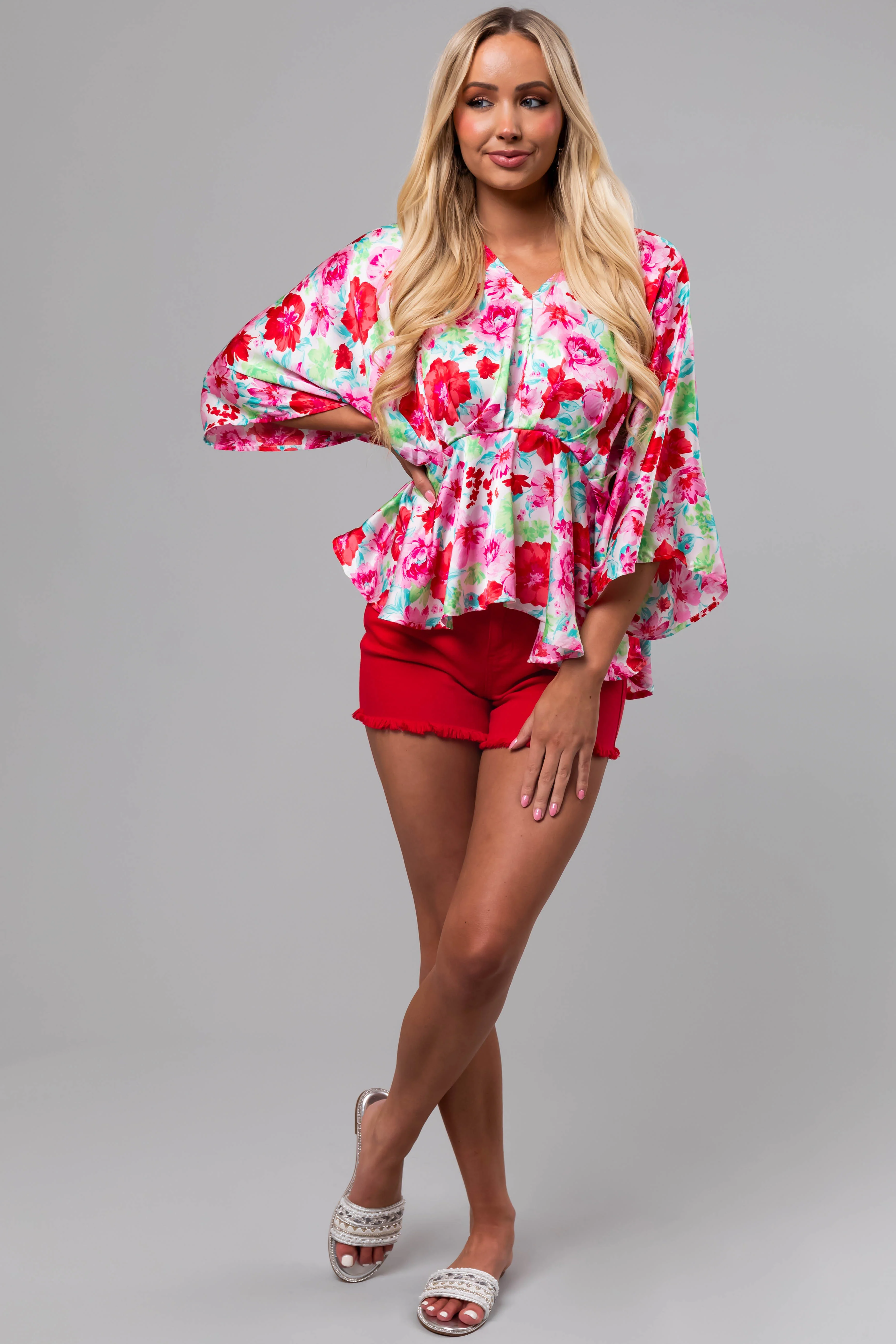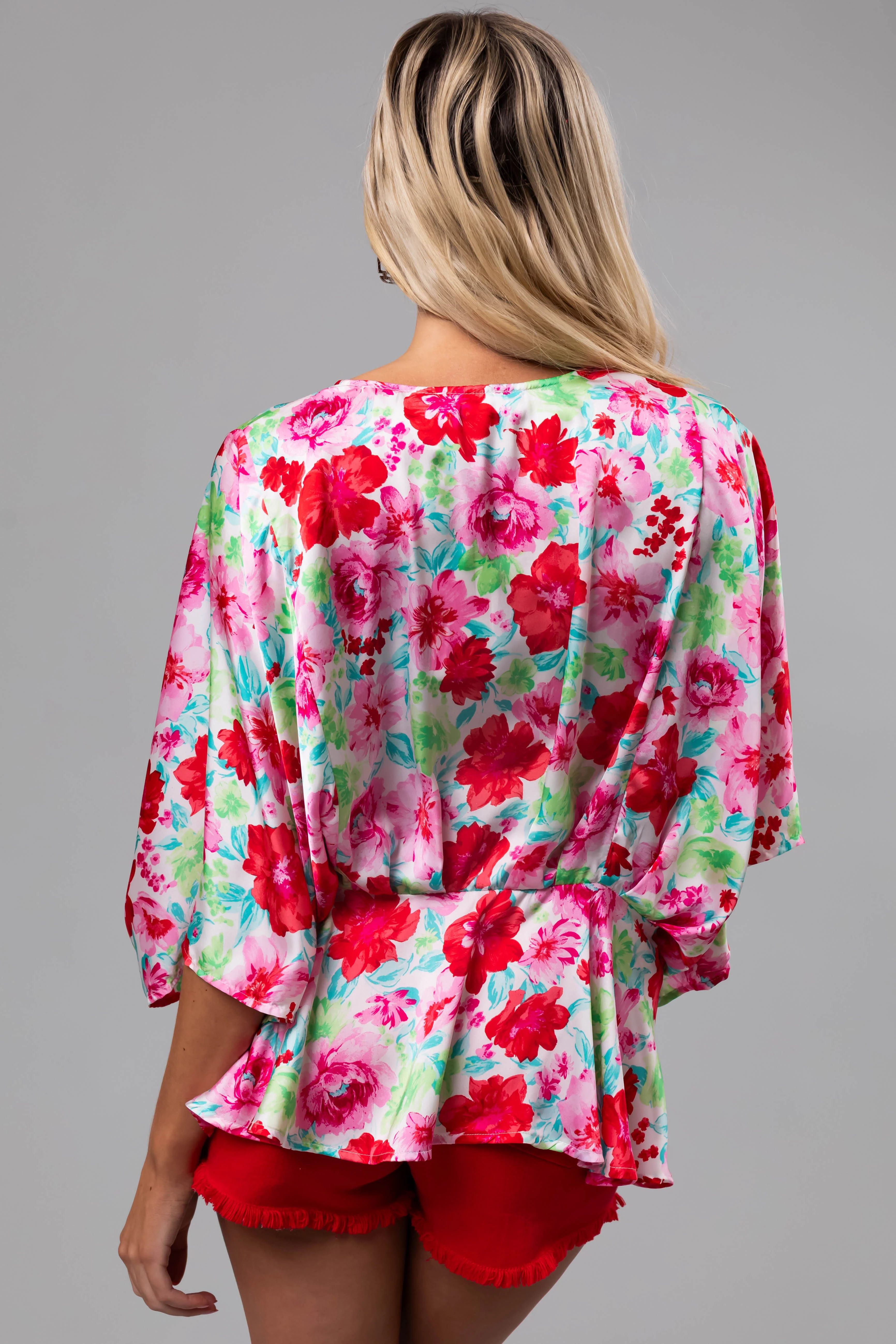 Coconut Floral Print V Neck Kimono Sleeve Top