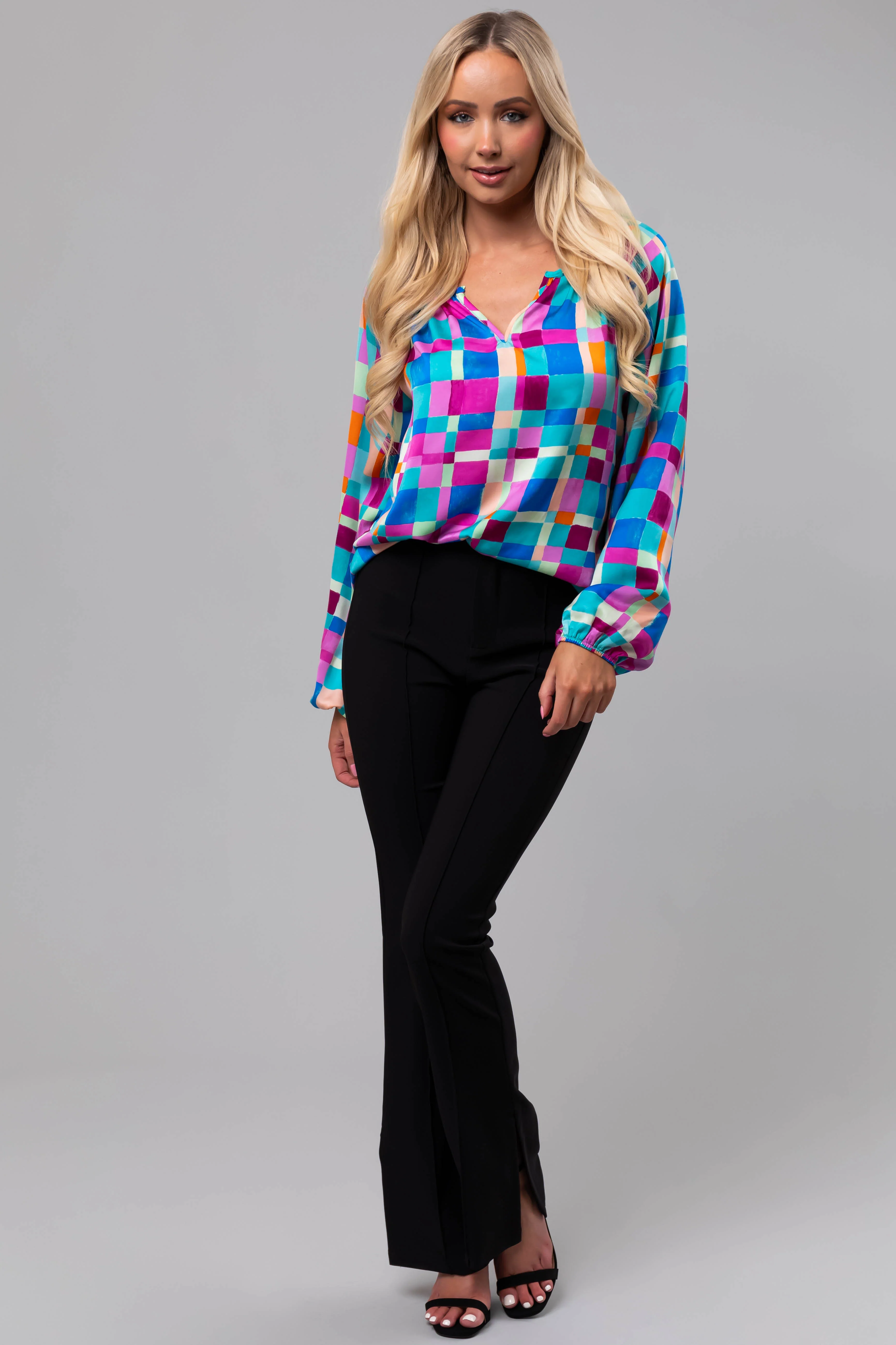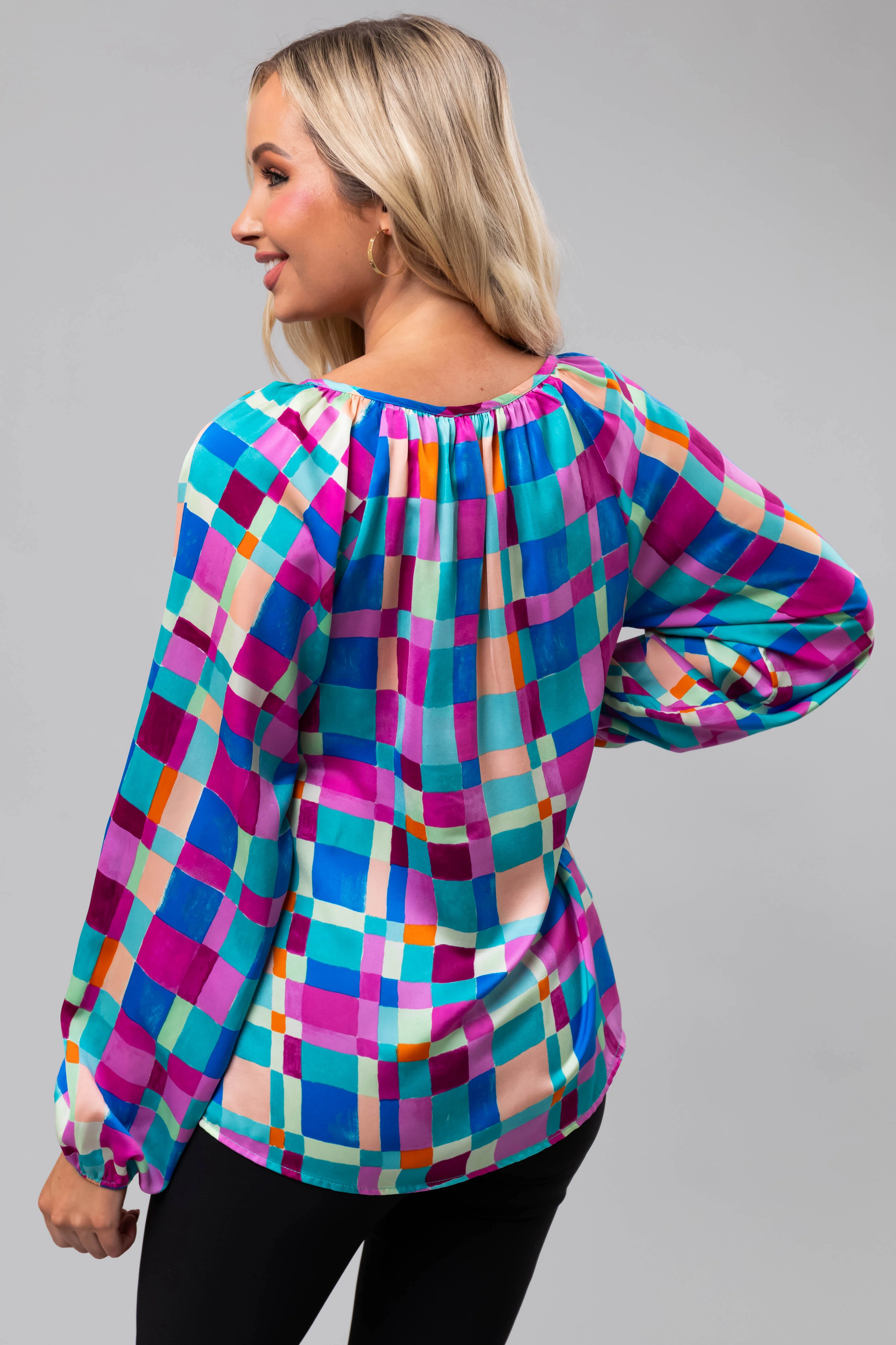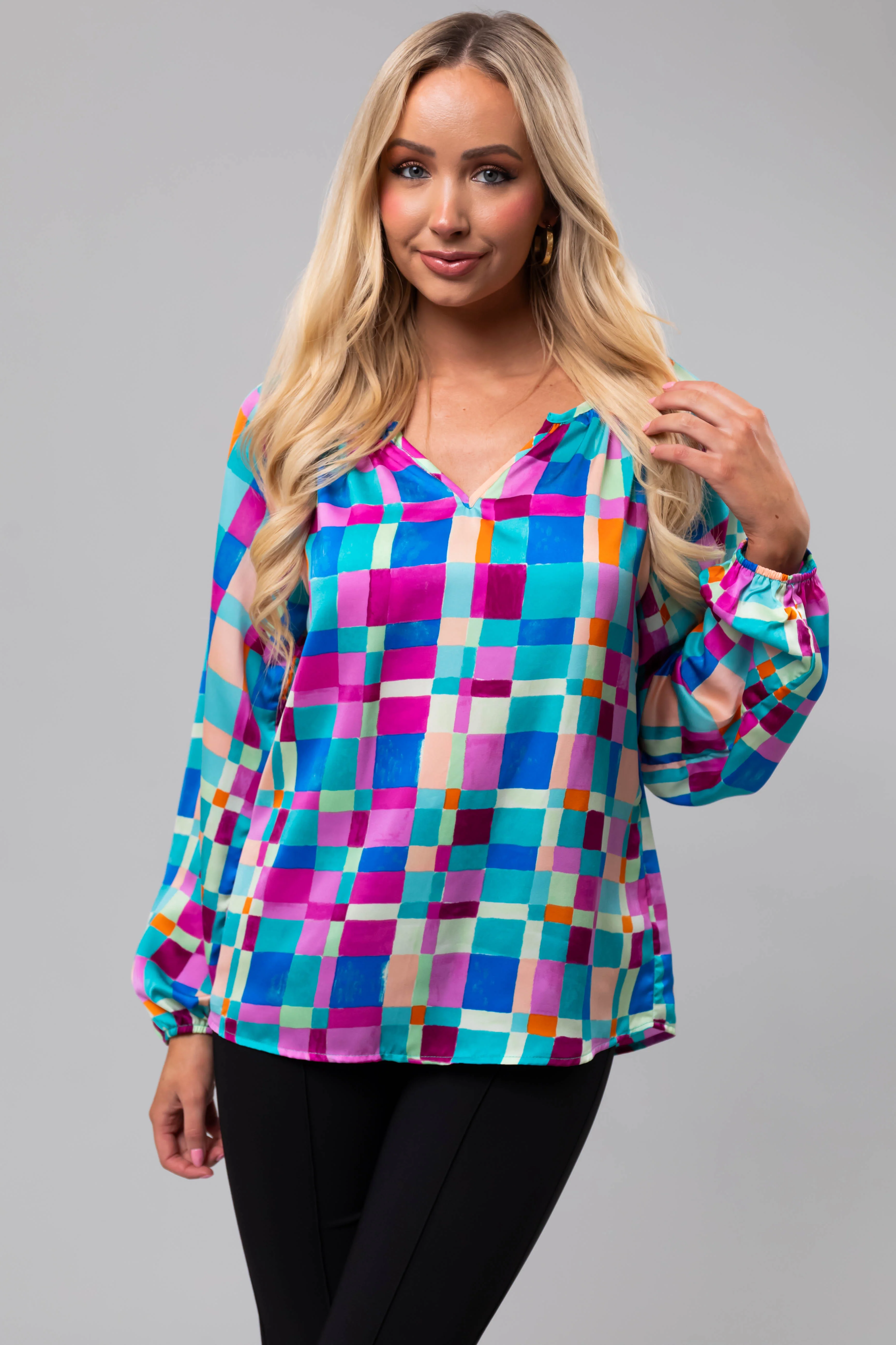 Turquoise Geo Print Long Sleeve V Neck Top