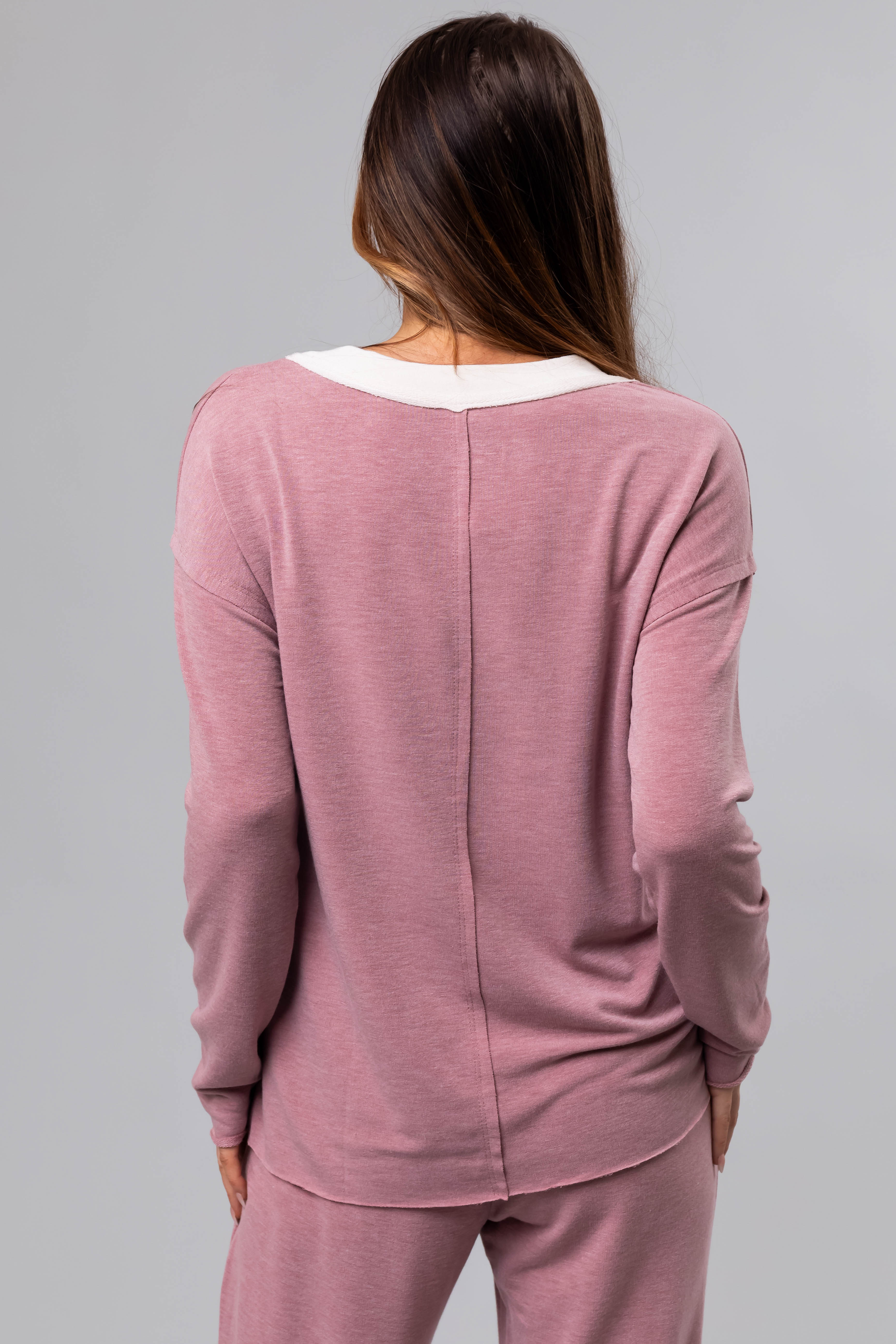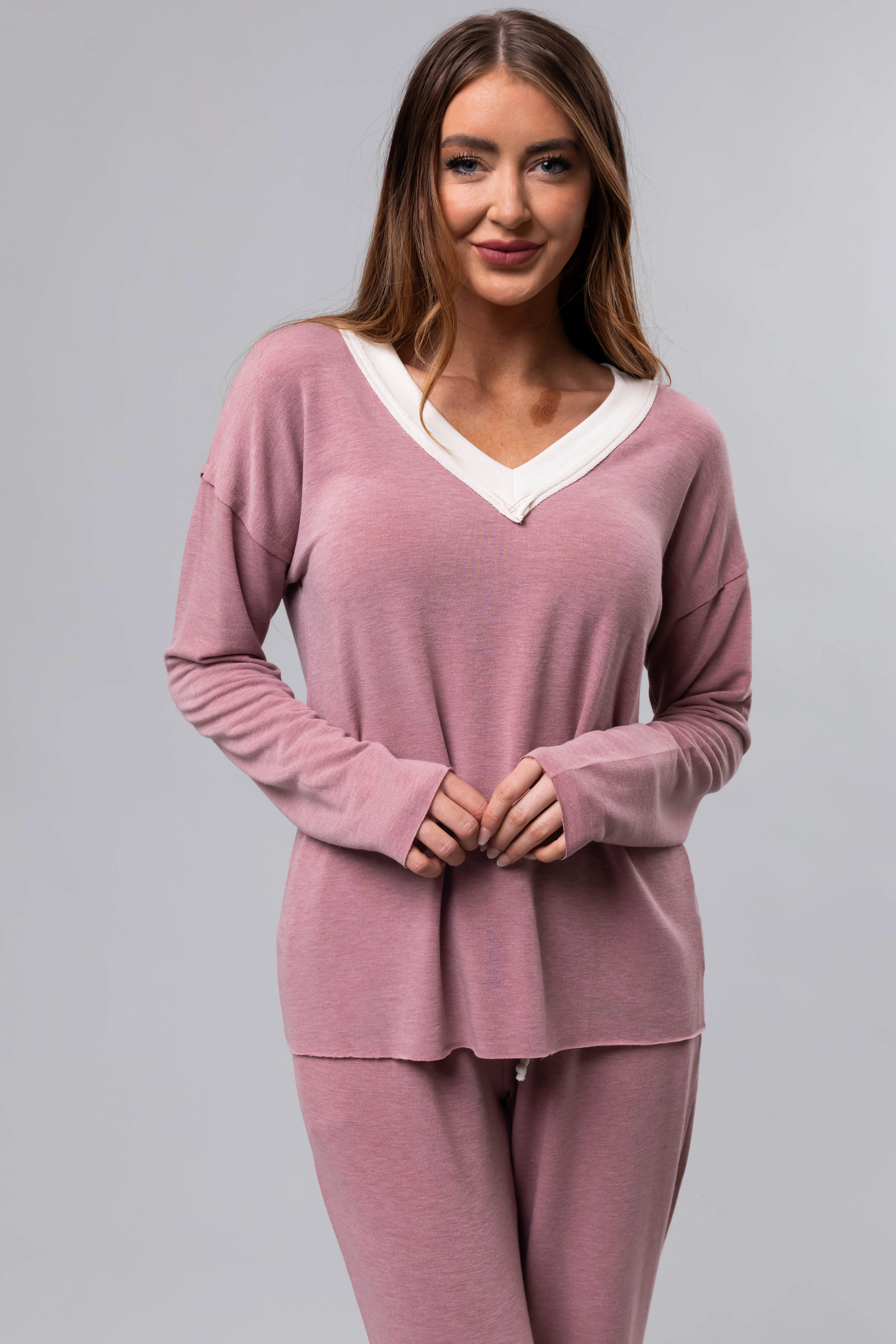 Heathered Rose Contrast V Neck Knit Top