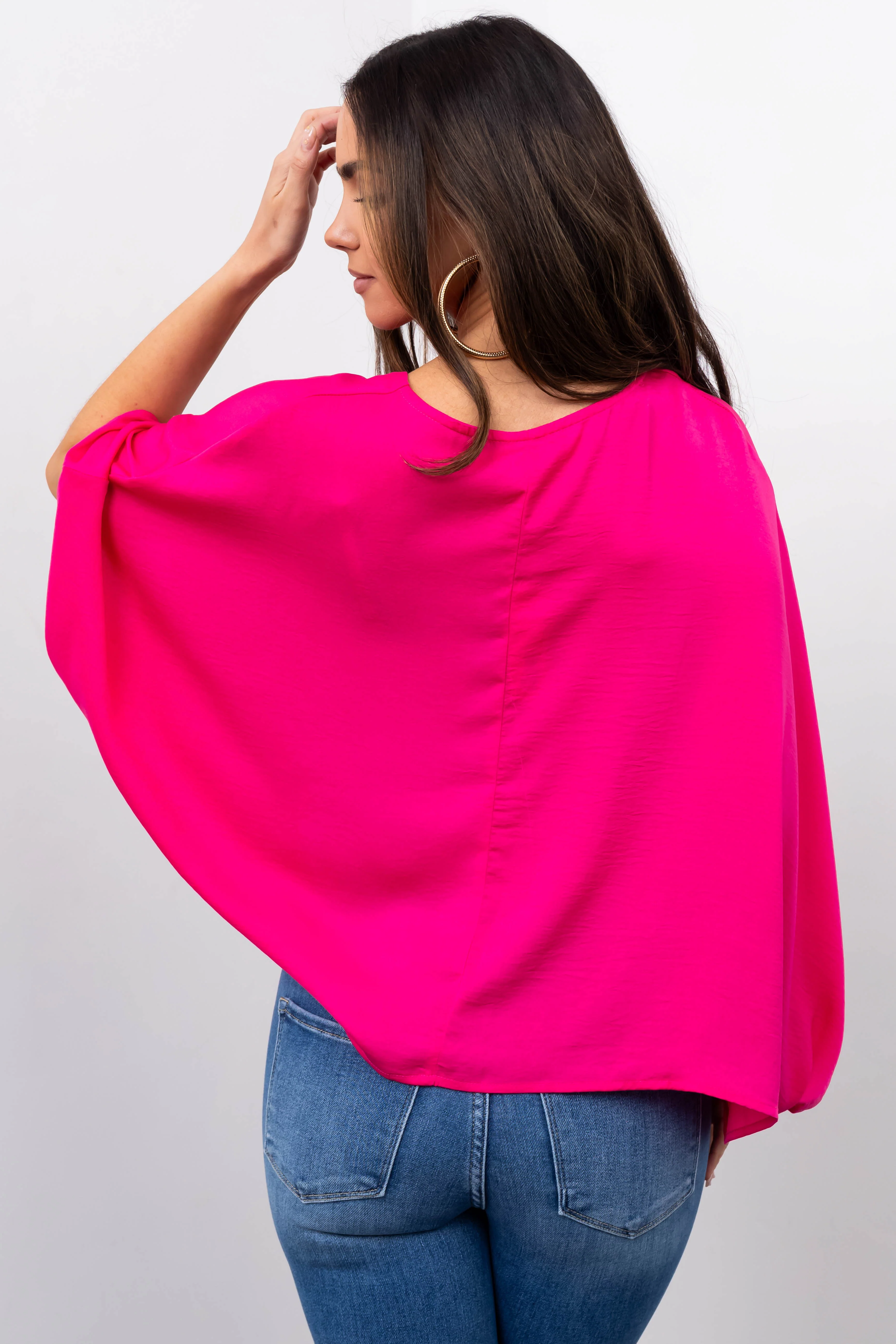 Hot Pink Satin Kimono Sleeve V Neck Crop Top