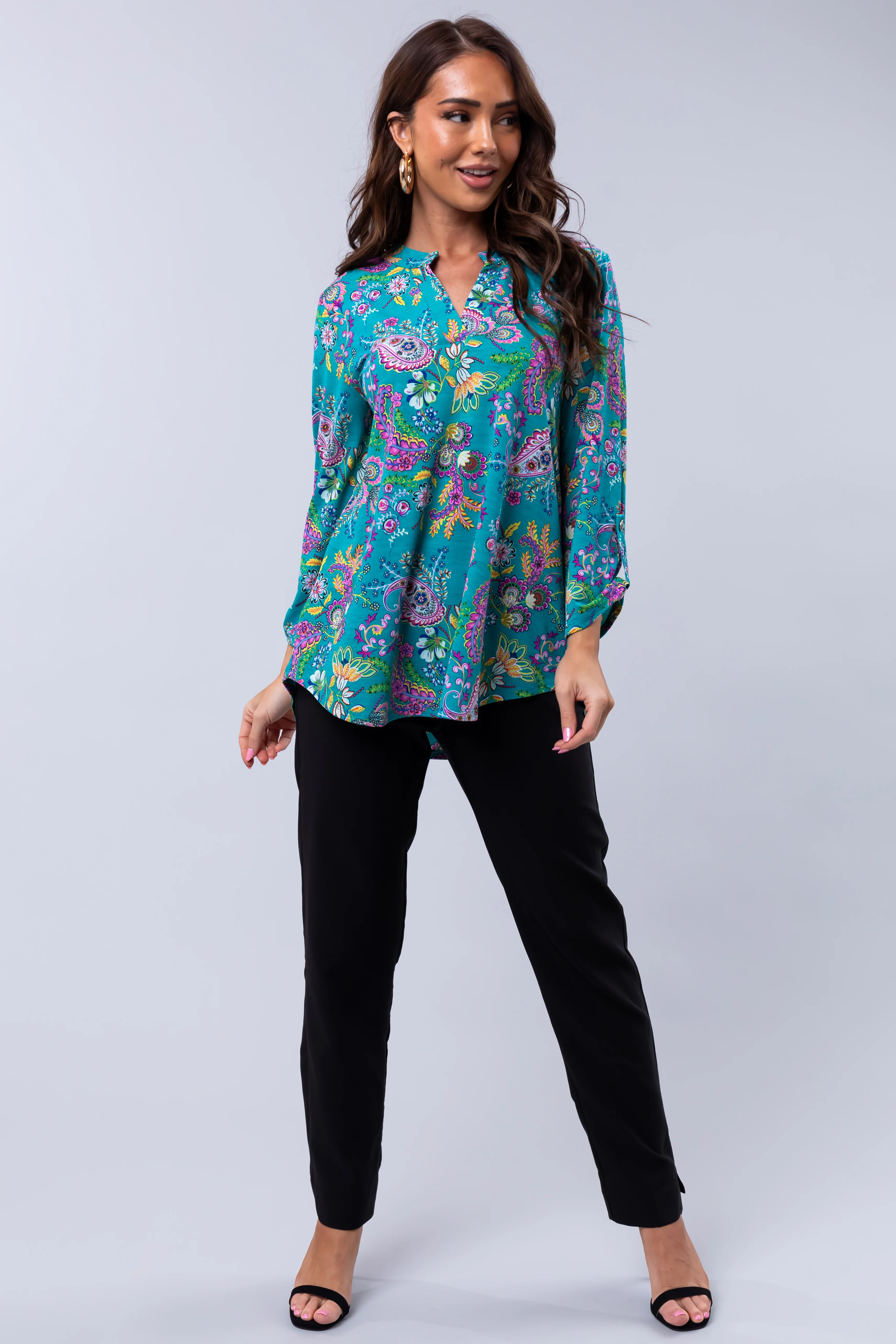 Teal Paisley Print 3/4 Sleeve Blouse