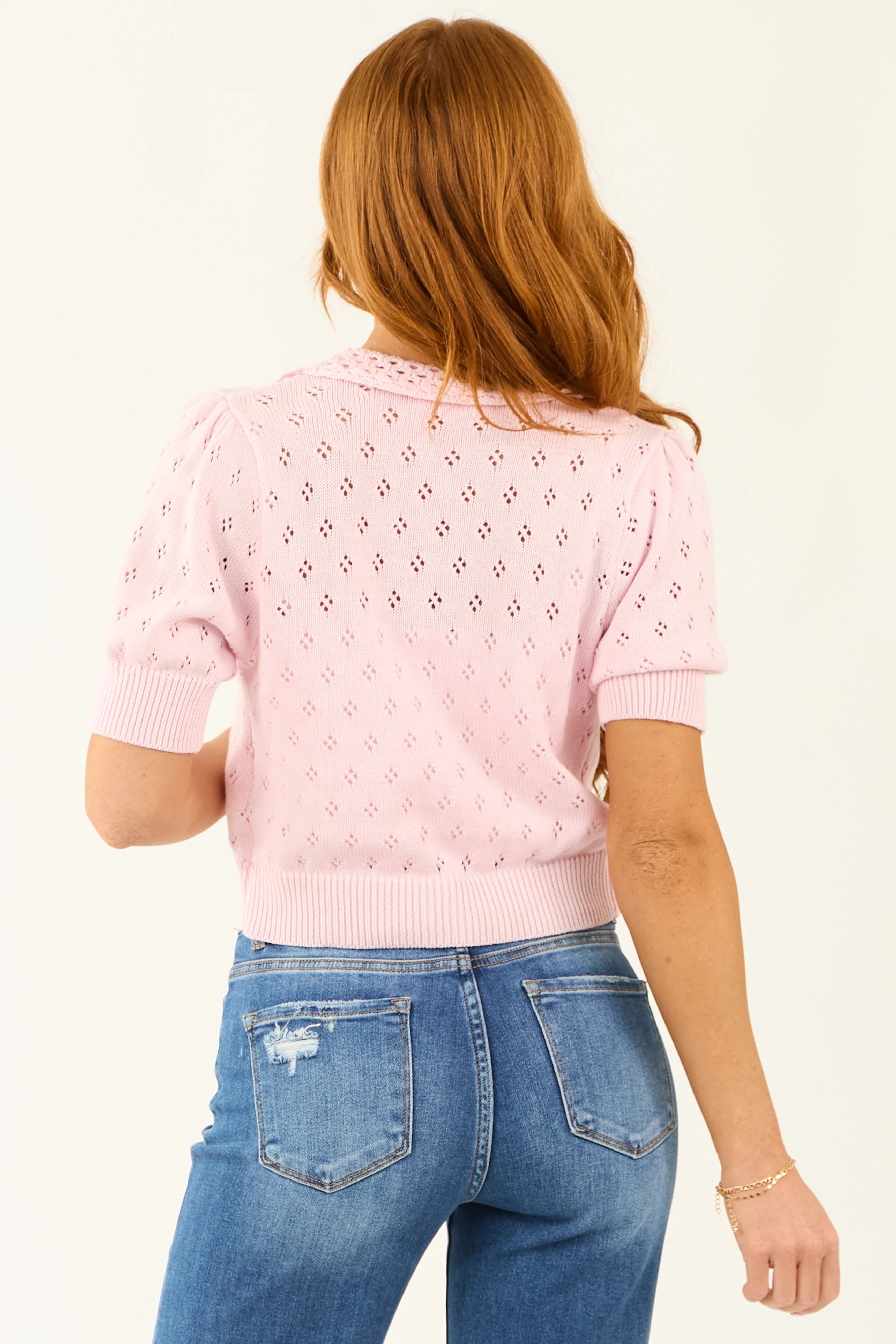 Carnation Pointelle Button Up Short Puff Sleeve Top