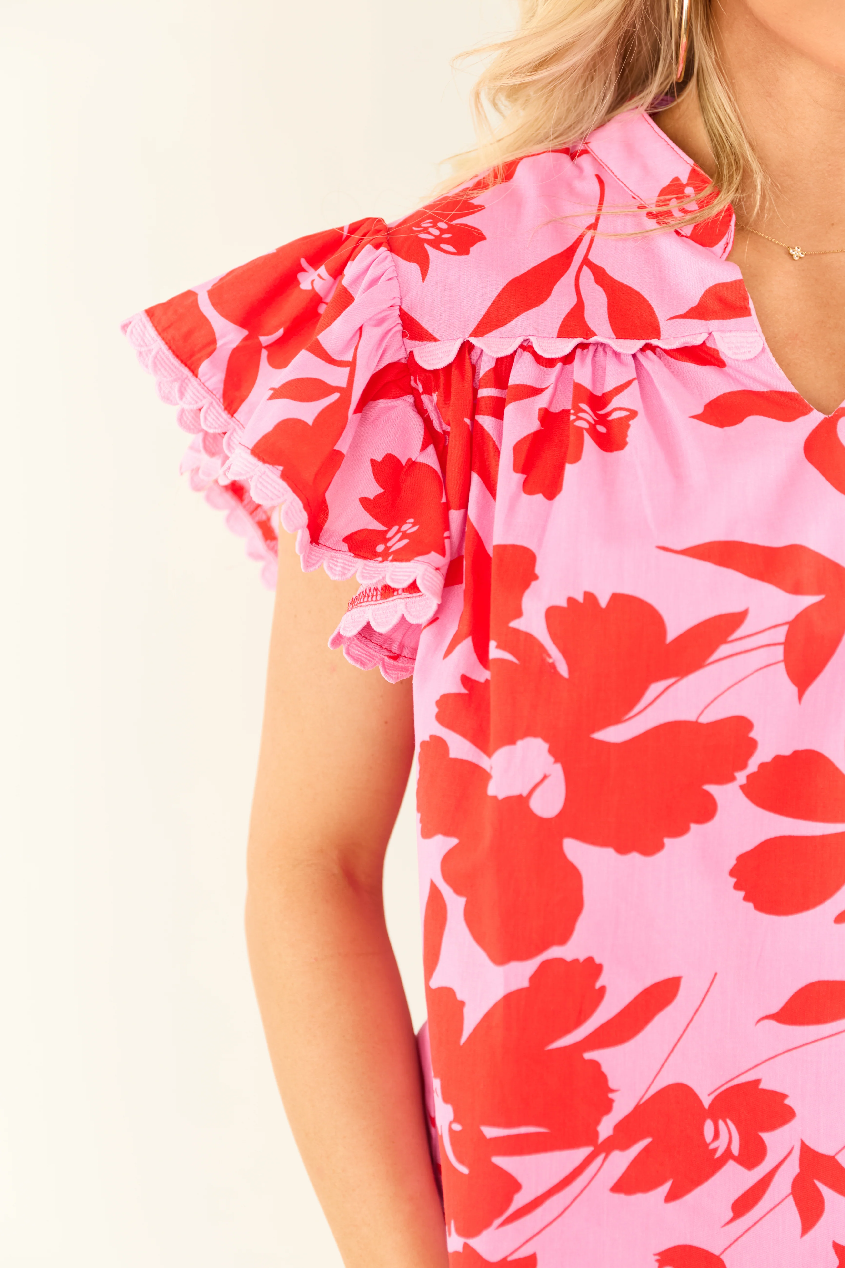 Bubblegum Floral Crochet Lace Trim Short Sleeve Top