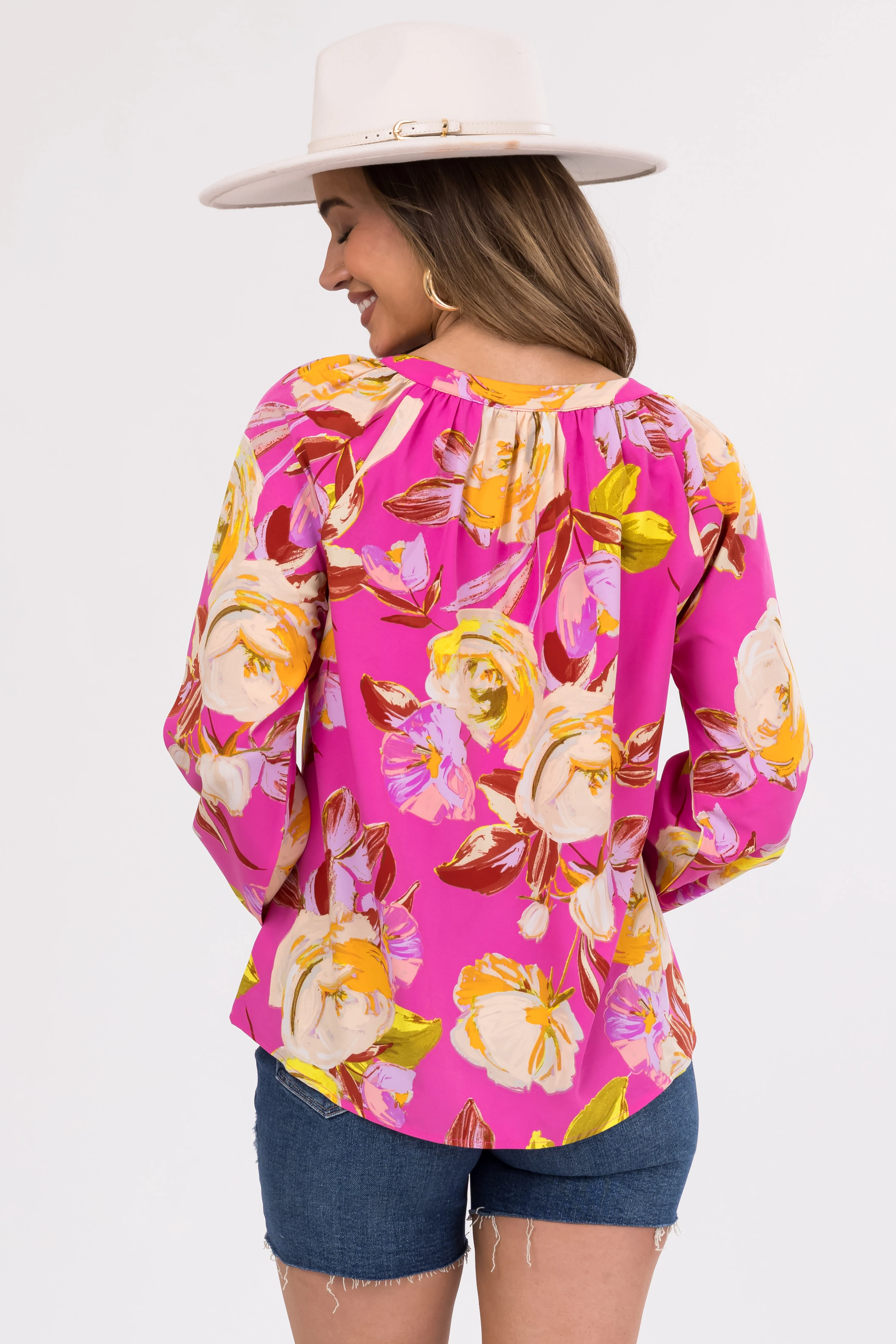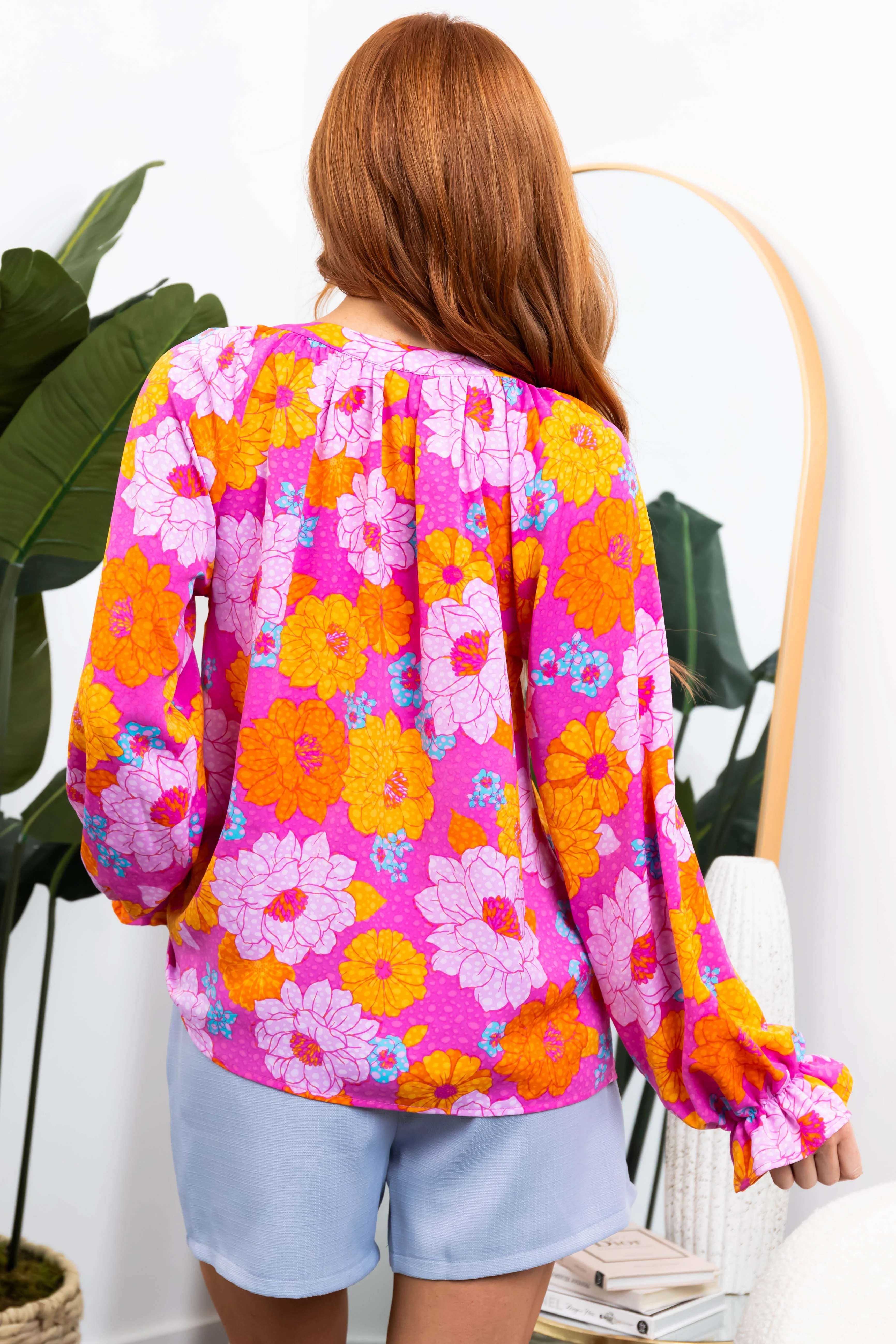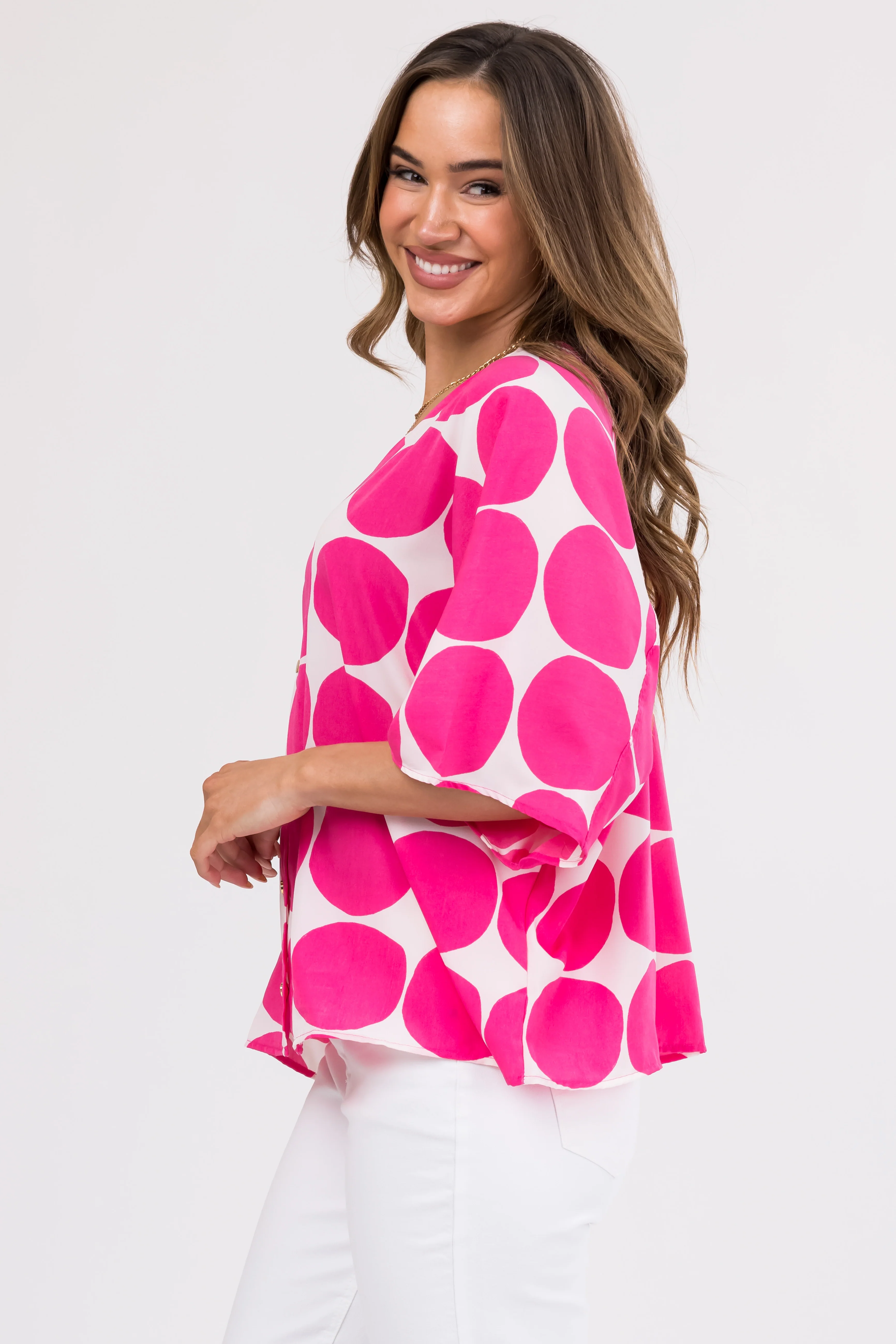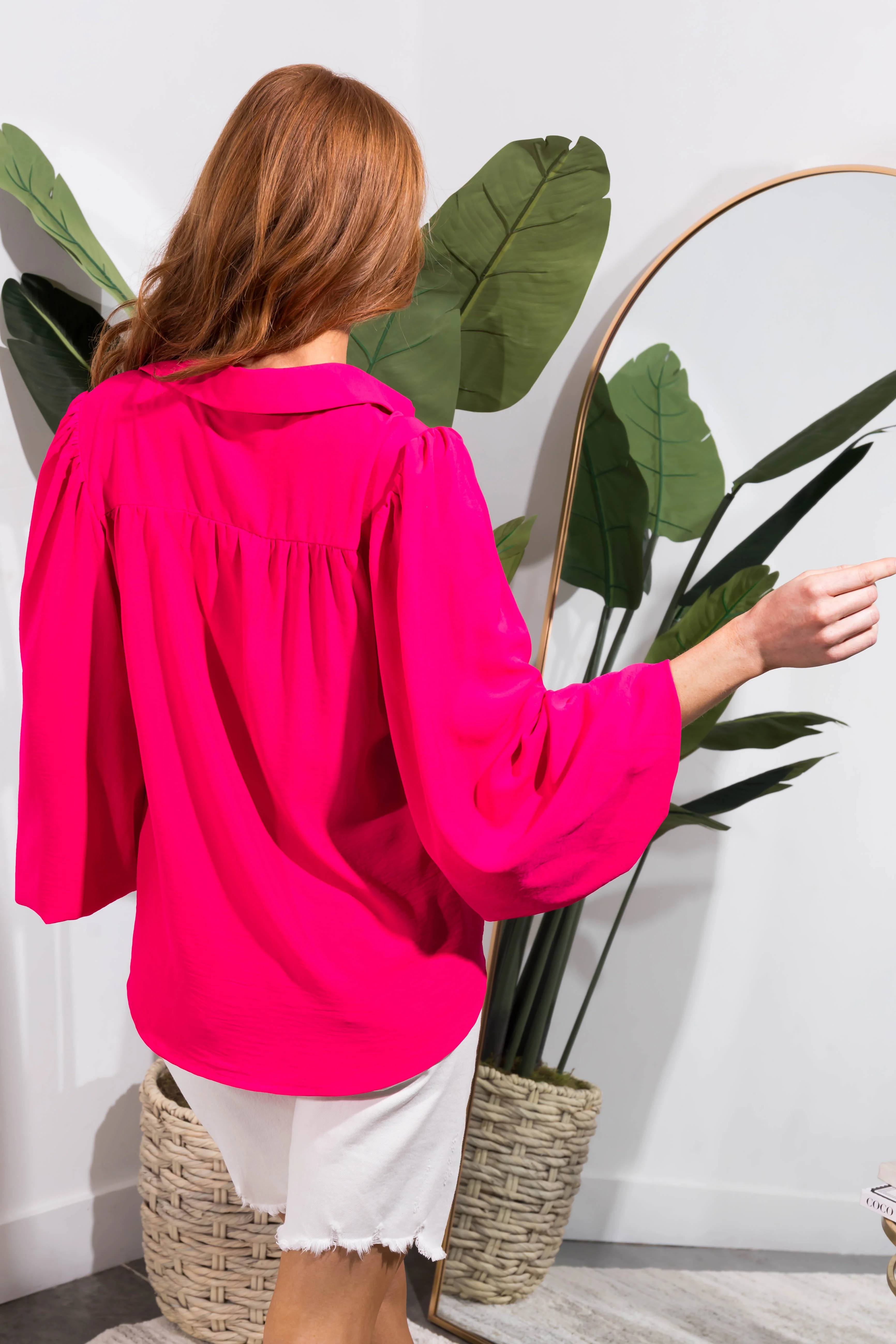 Flying Tomato Hot Pink Bubble Sleeve Button Blouse