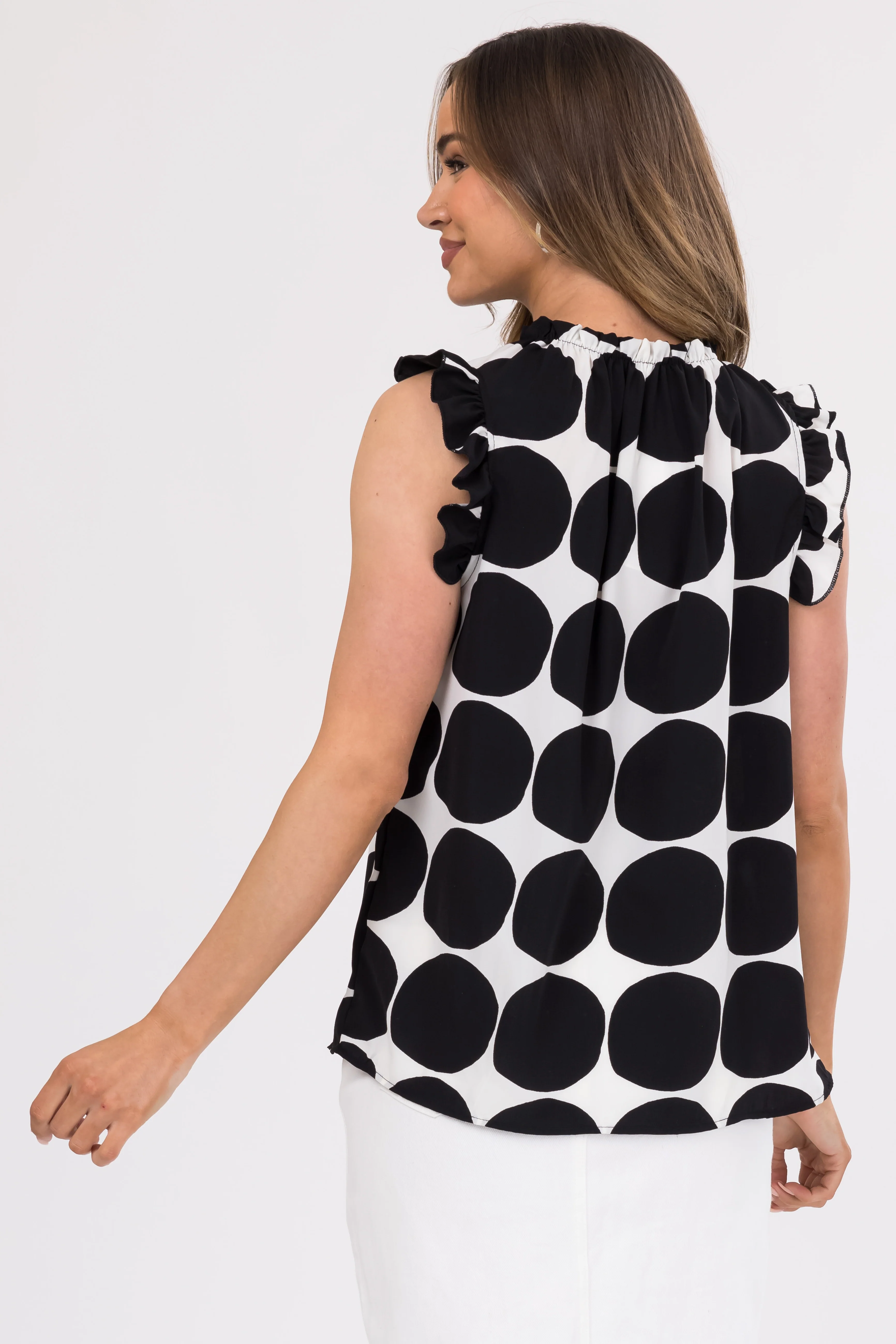 Black and Ivory Polka Dot Ruffle Cap Sleeve Top