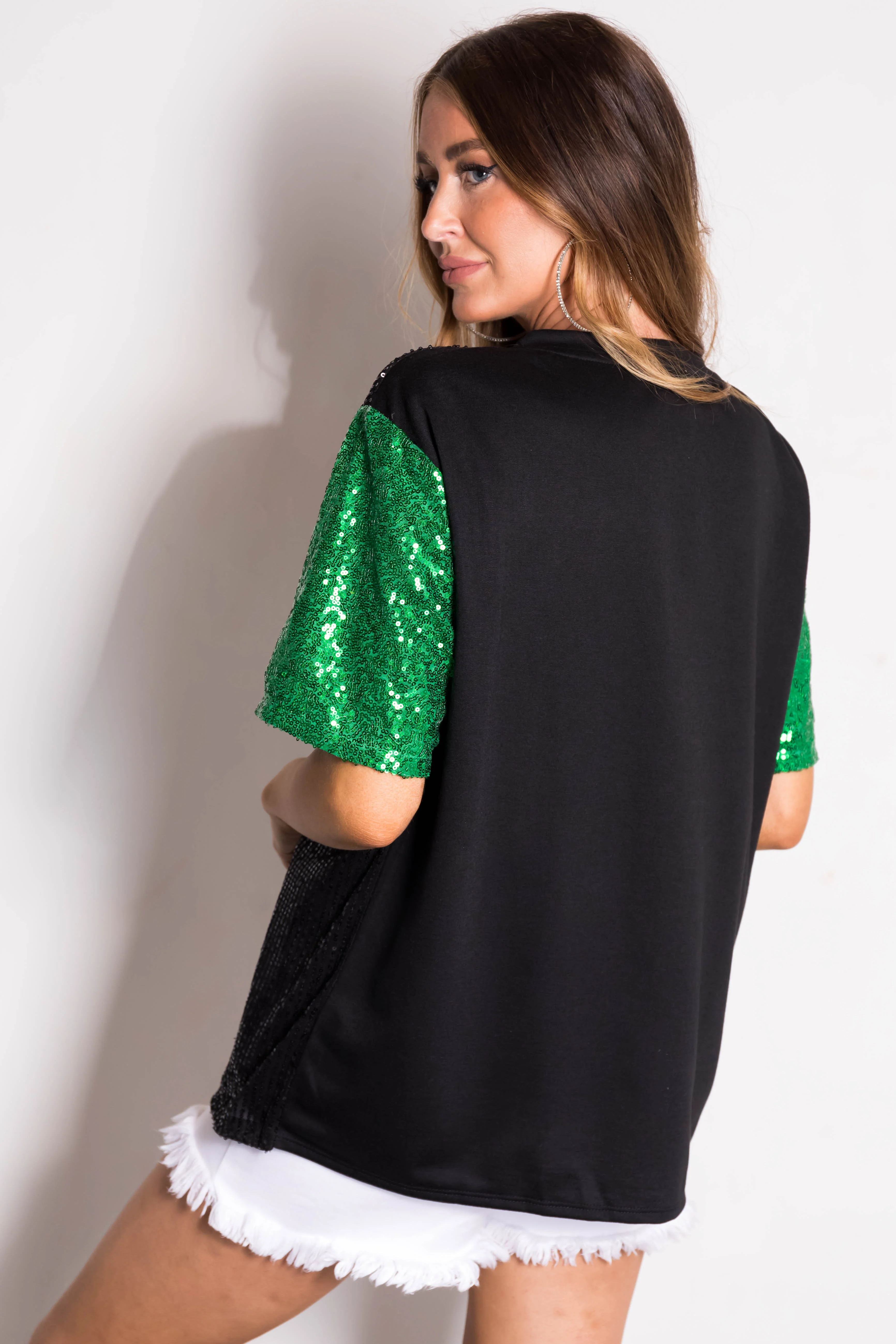 Black Sequined Clover Graphic Half Sleeve Top