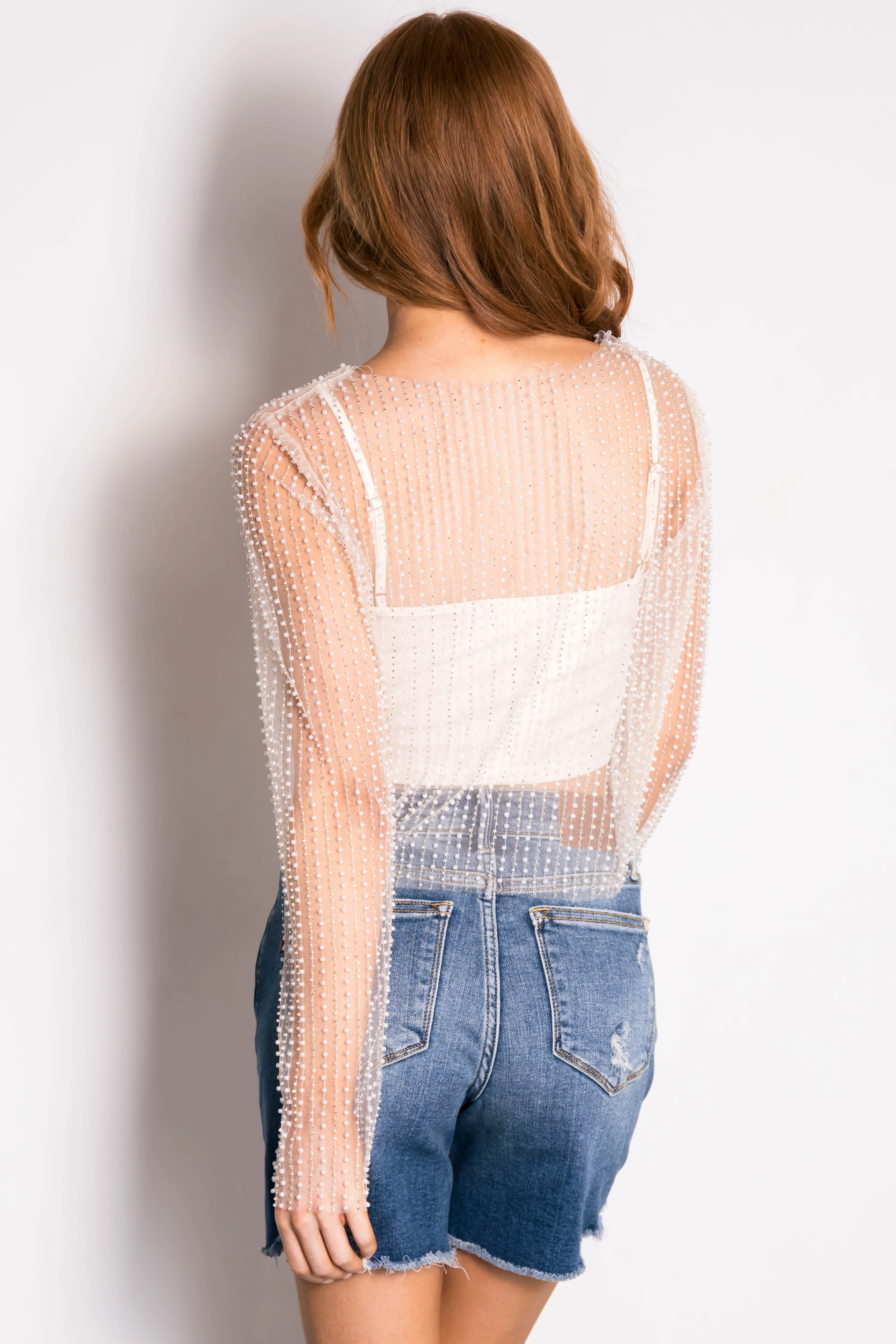 Cream Pearl Bead Long Sleeve Mesh Top