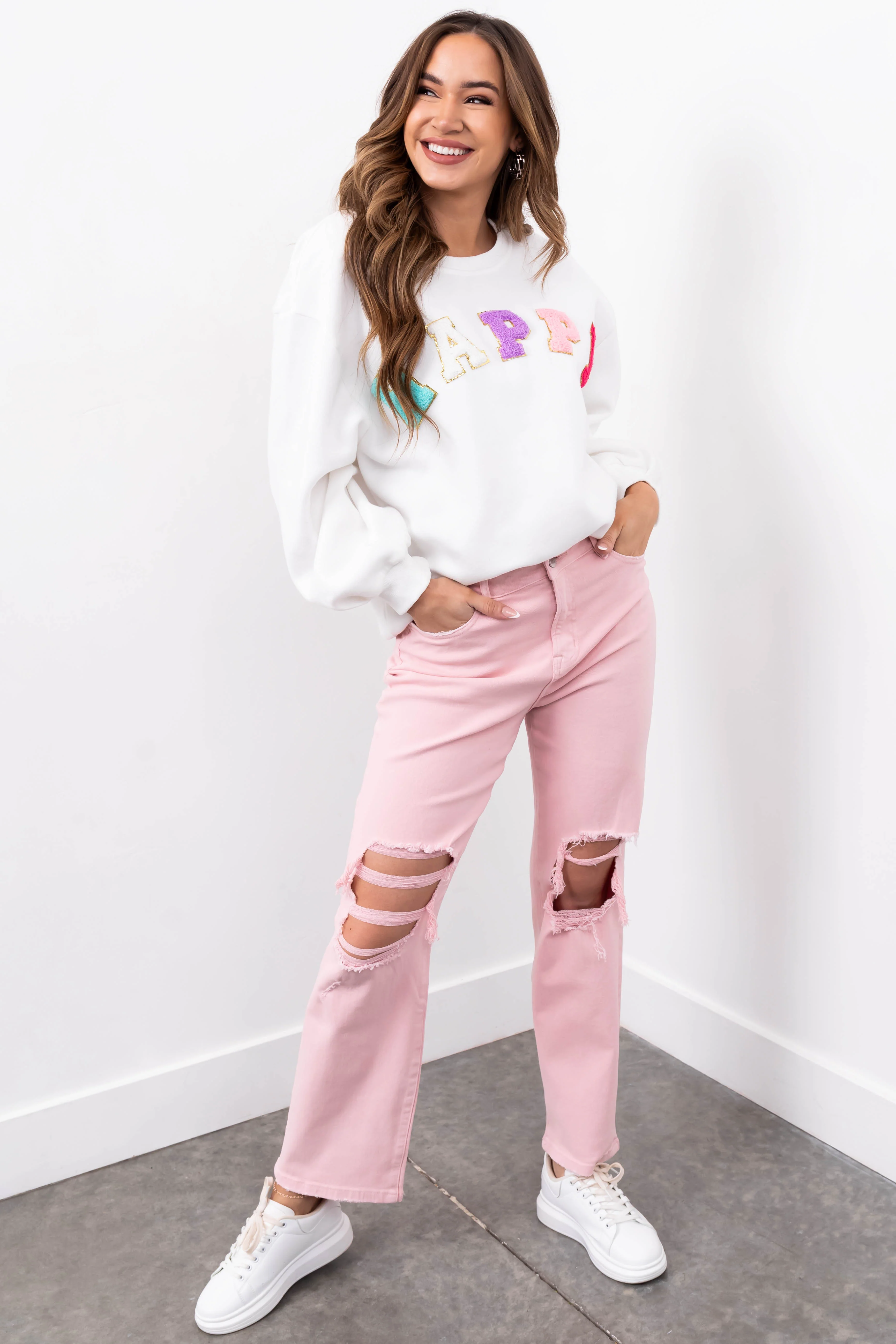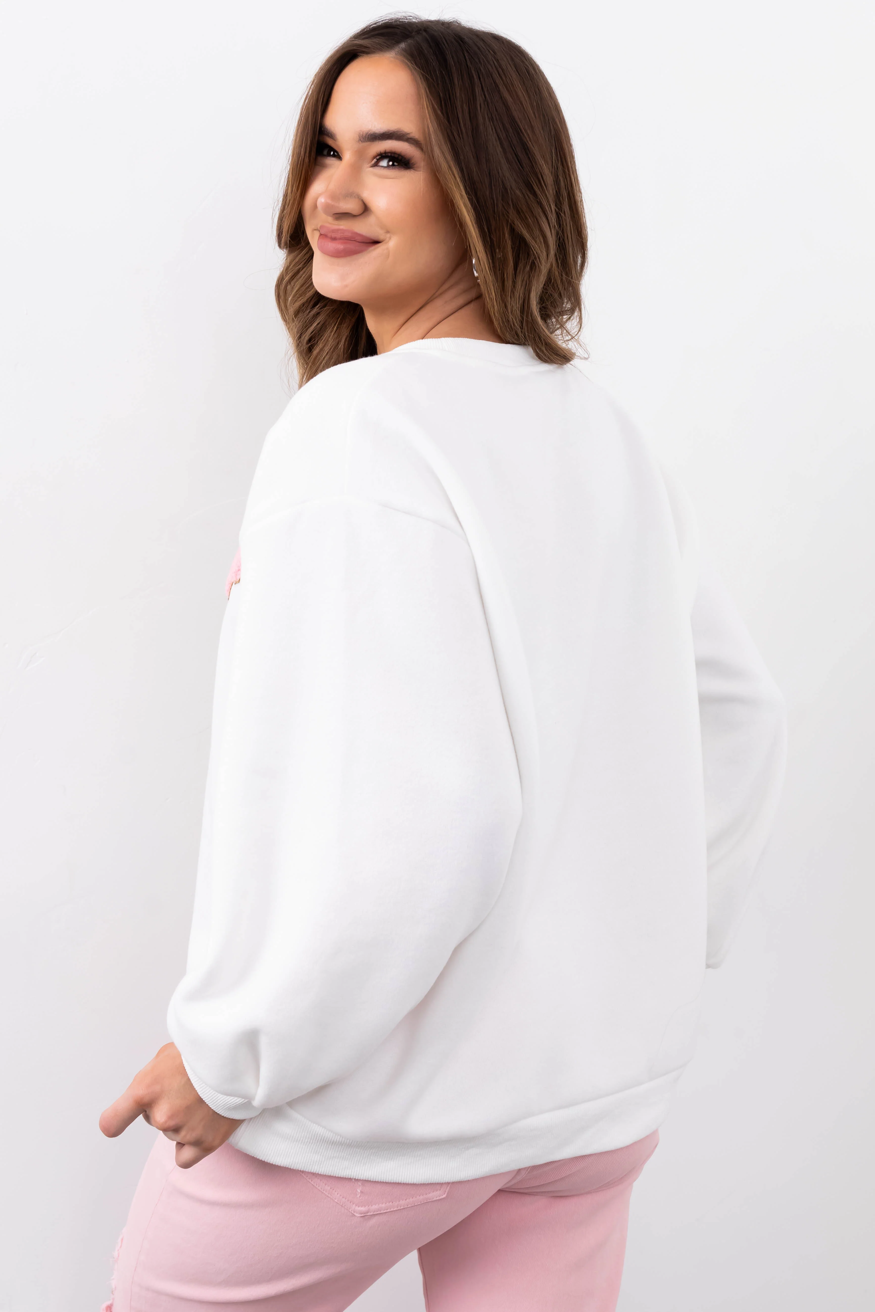 She+Sky Off White 'Happy' Sherpa Patch Sweatshirt