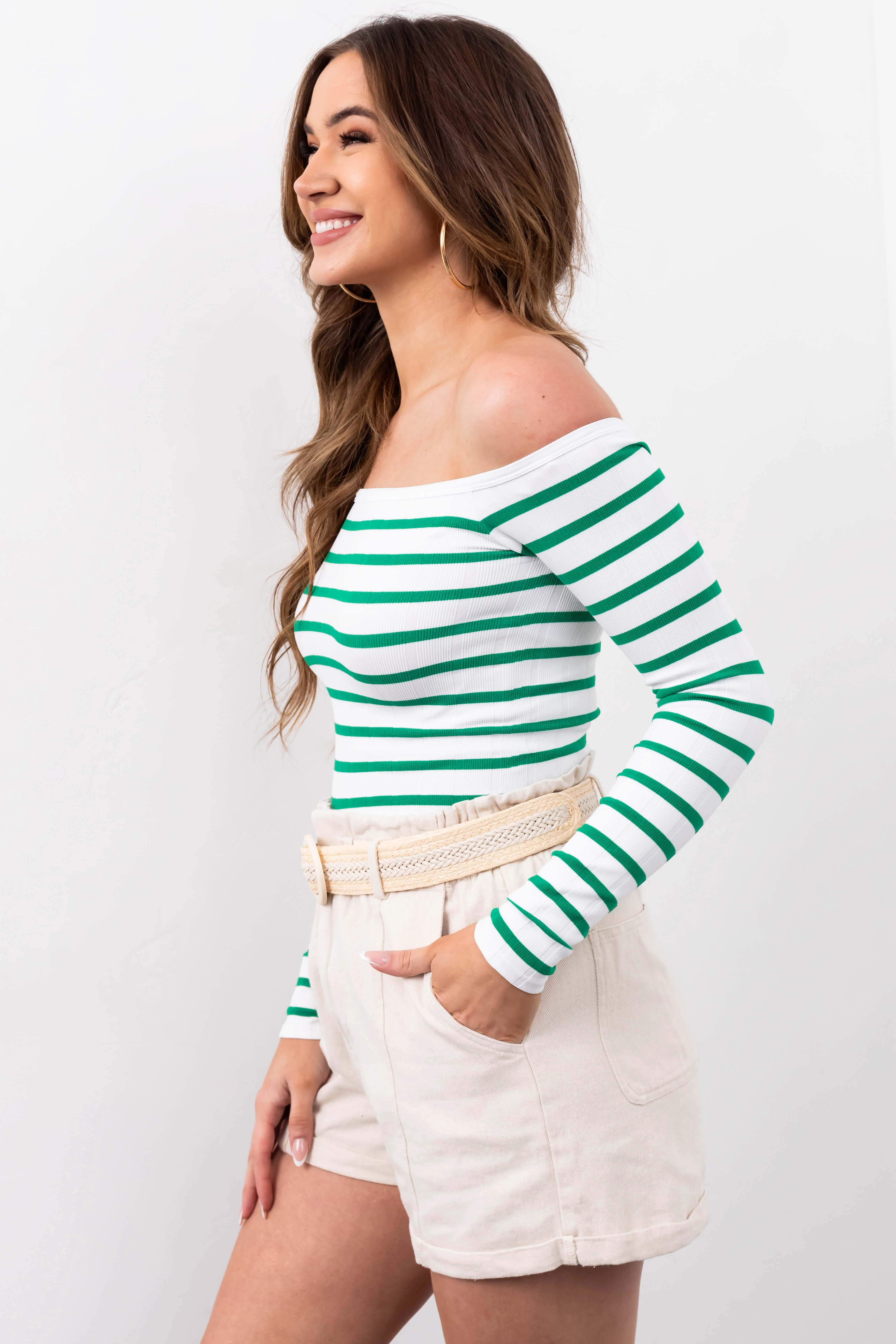White and Jade Striped Long Sleeve Knit Top
