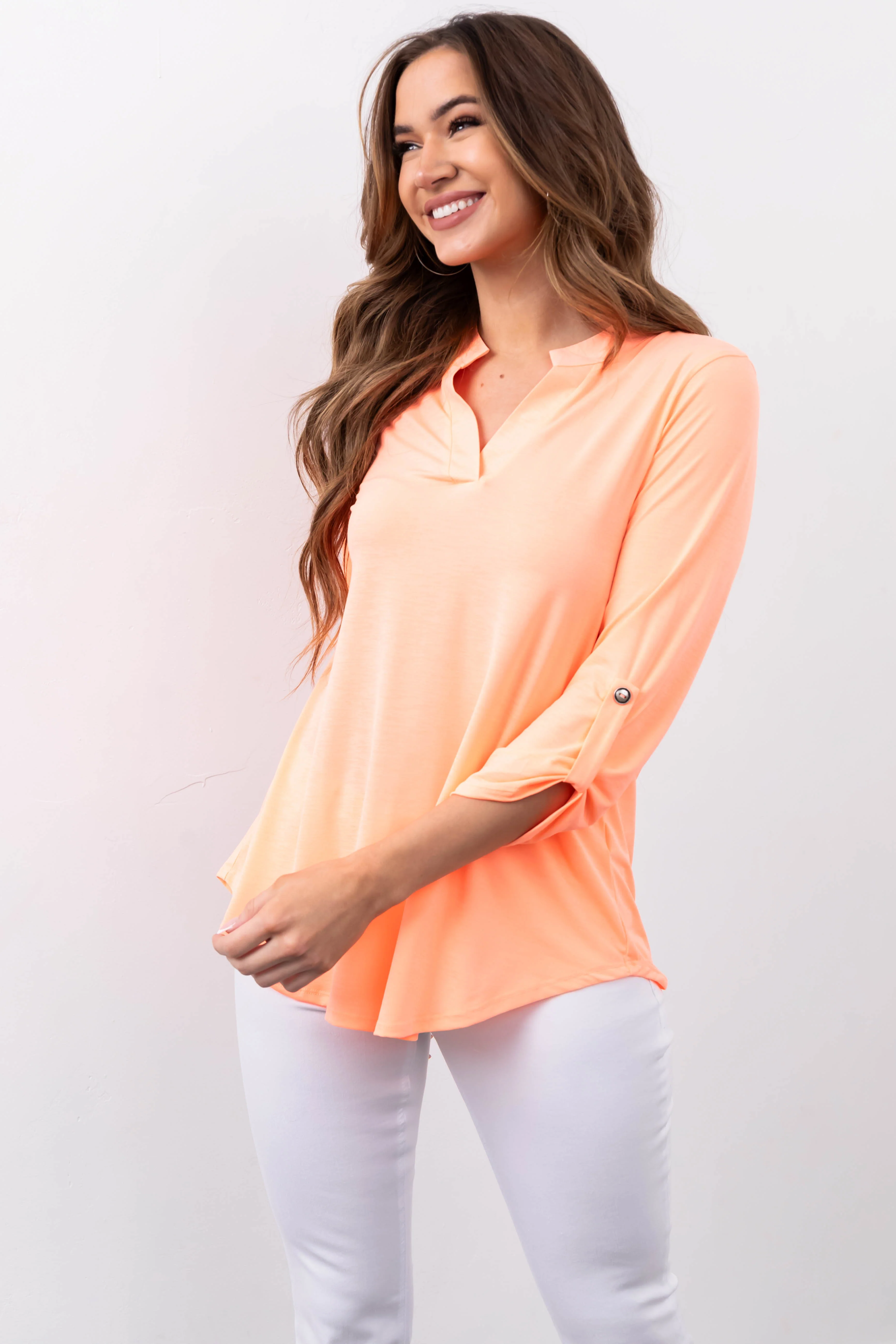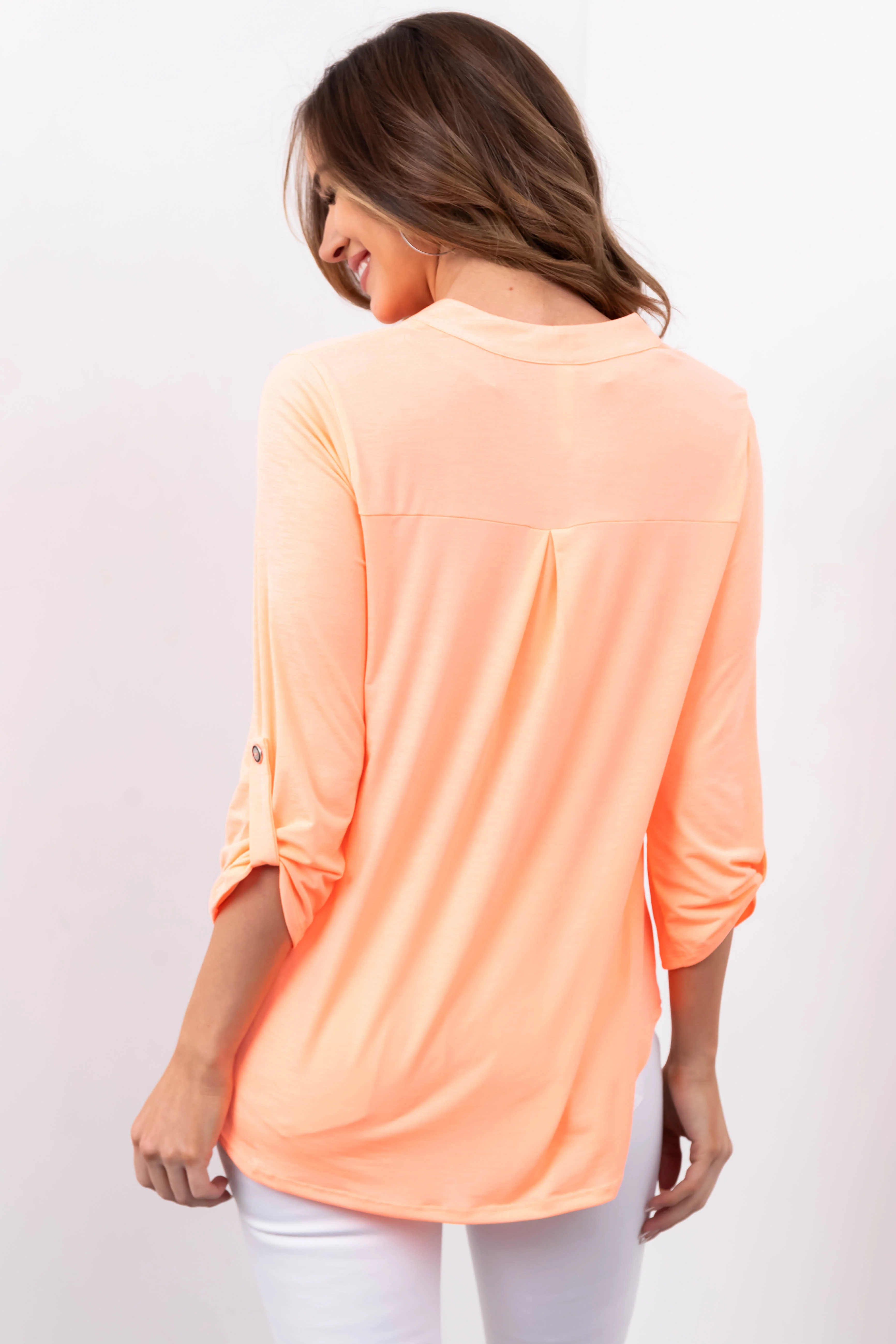 Neon Orange Notch Neck Cuffed Sleeve Top