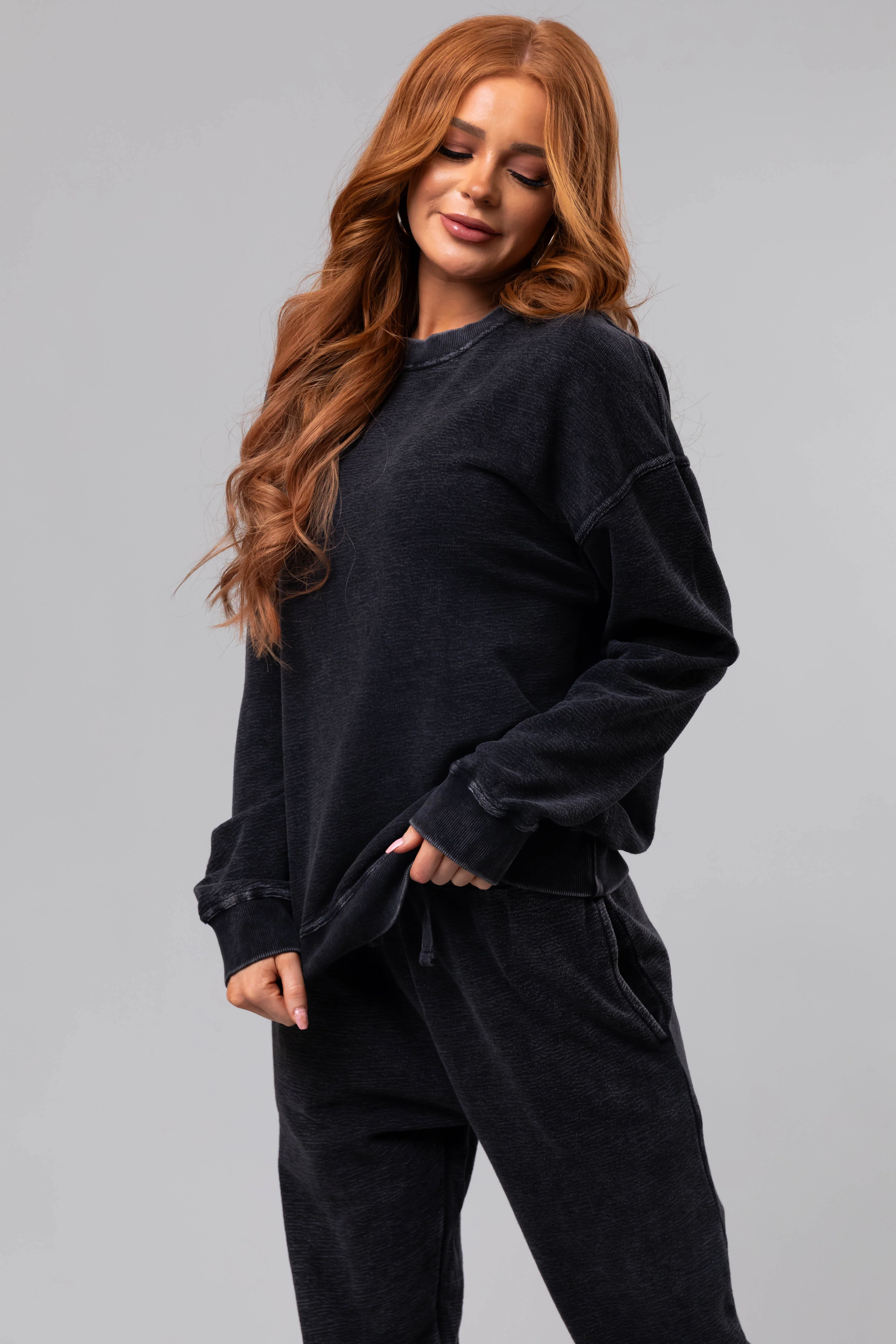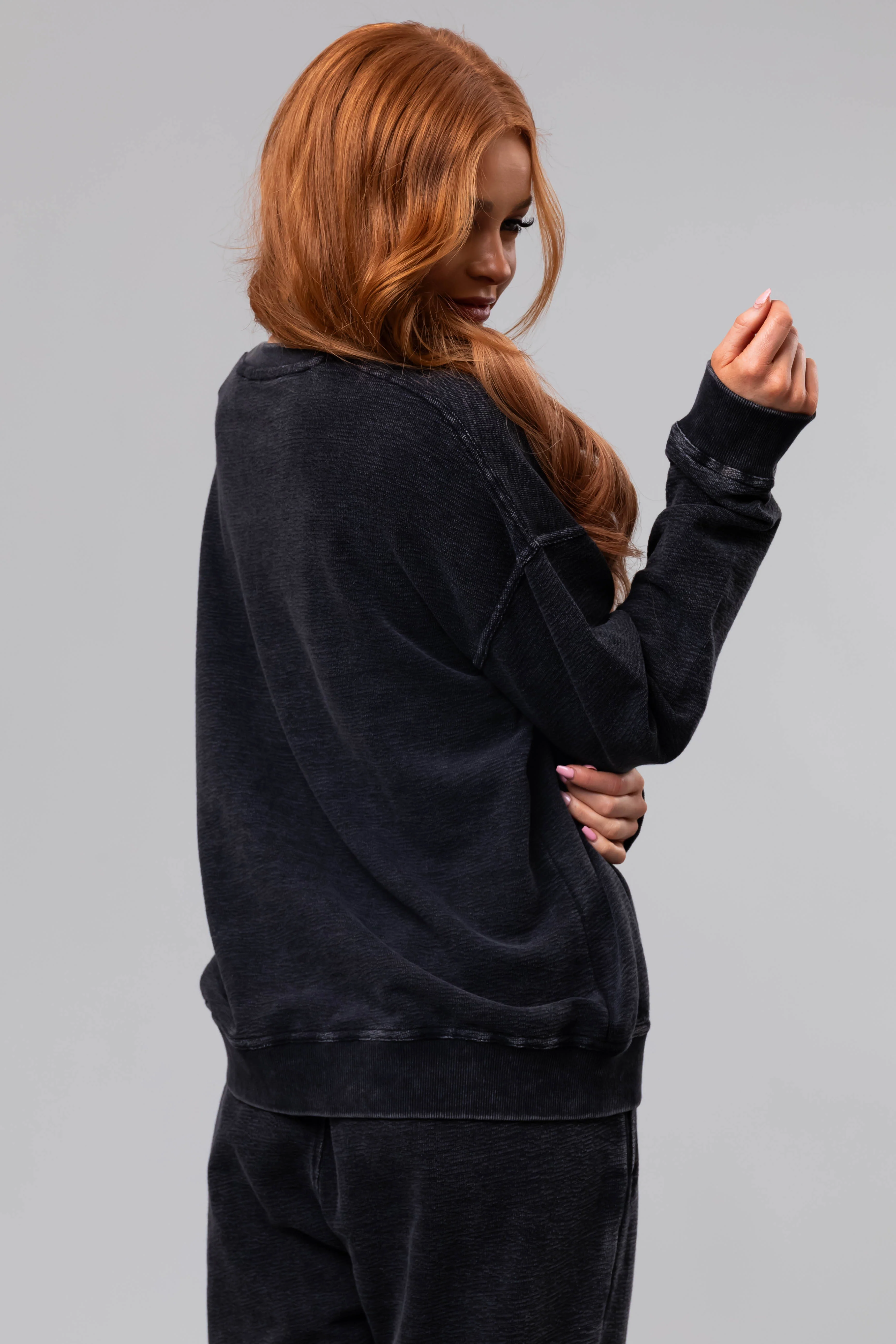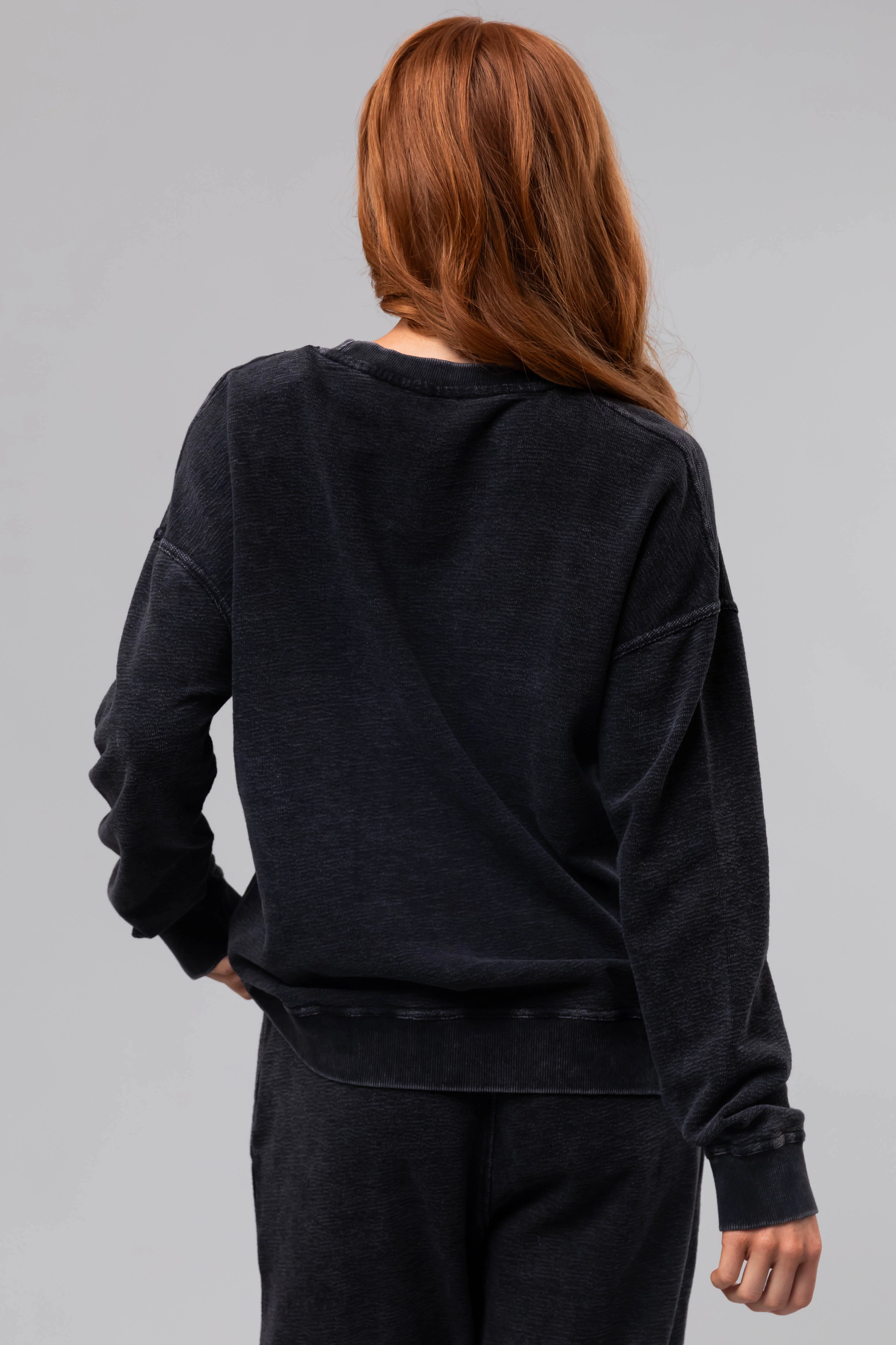Washed Black Textured Cotton Crew Neck Sweatshirt