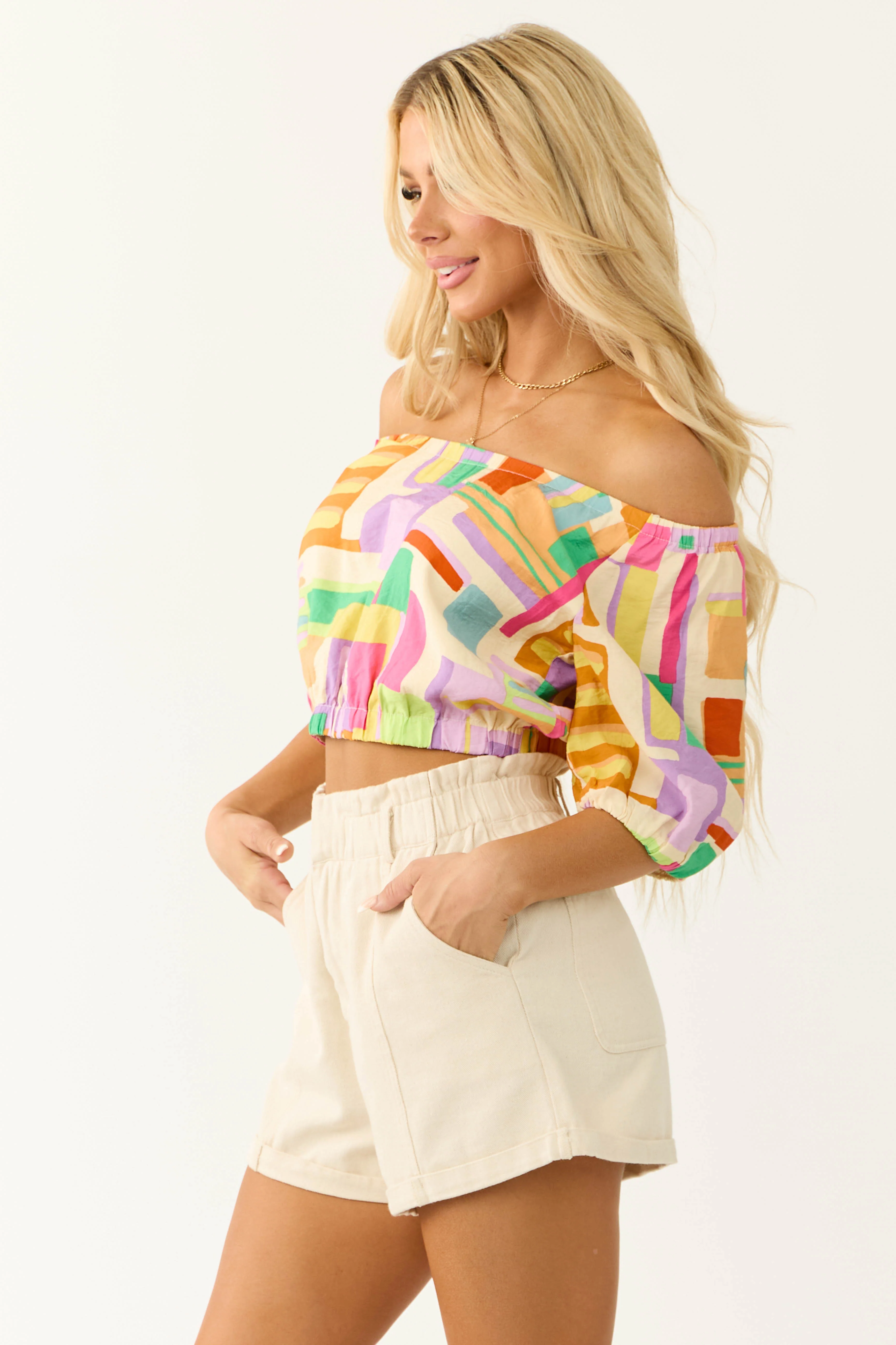 Cream Multicolor Geo Print Crop Top