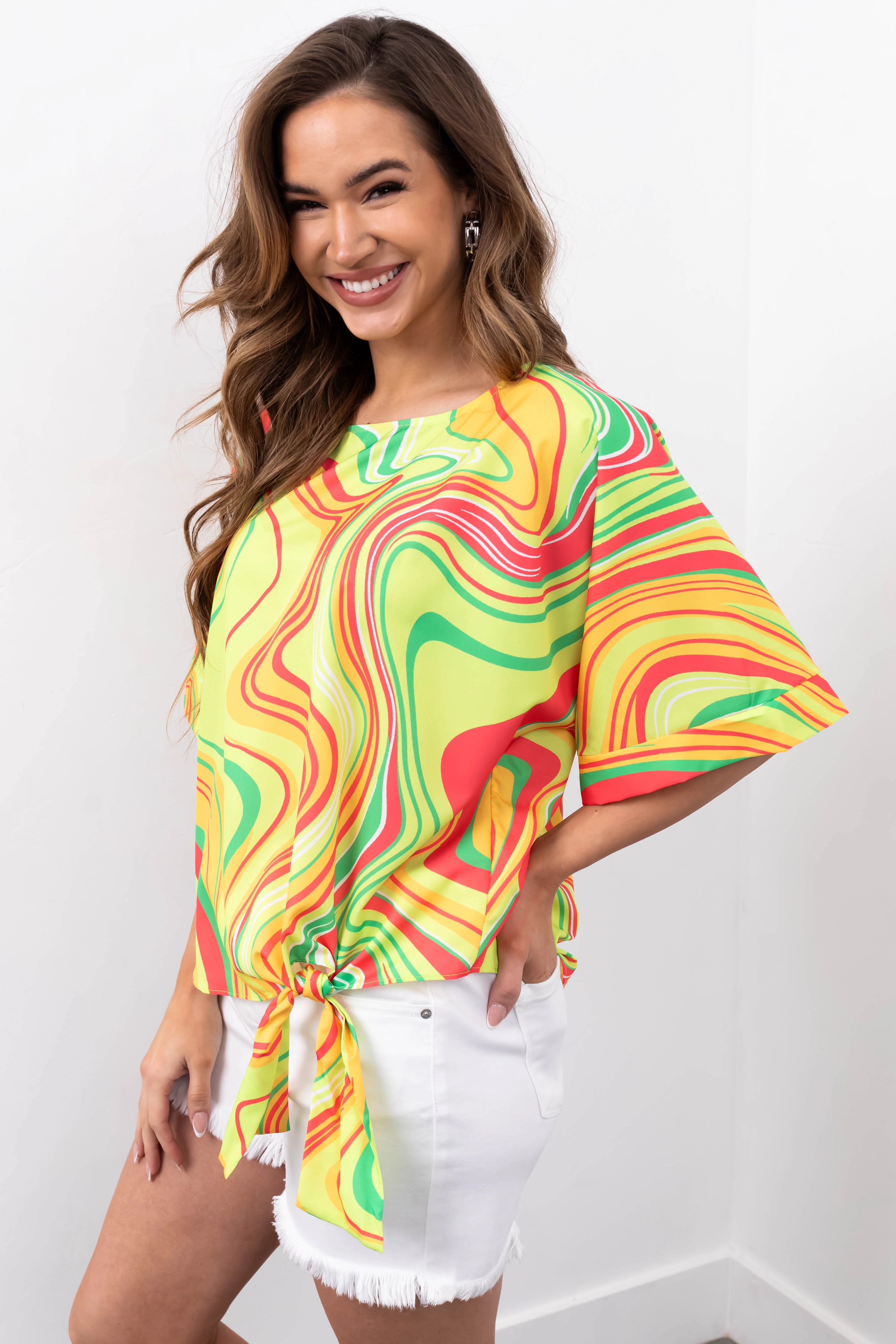 She+Sky Lime Abstract Print Side Tie Top