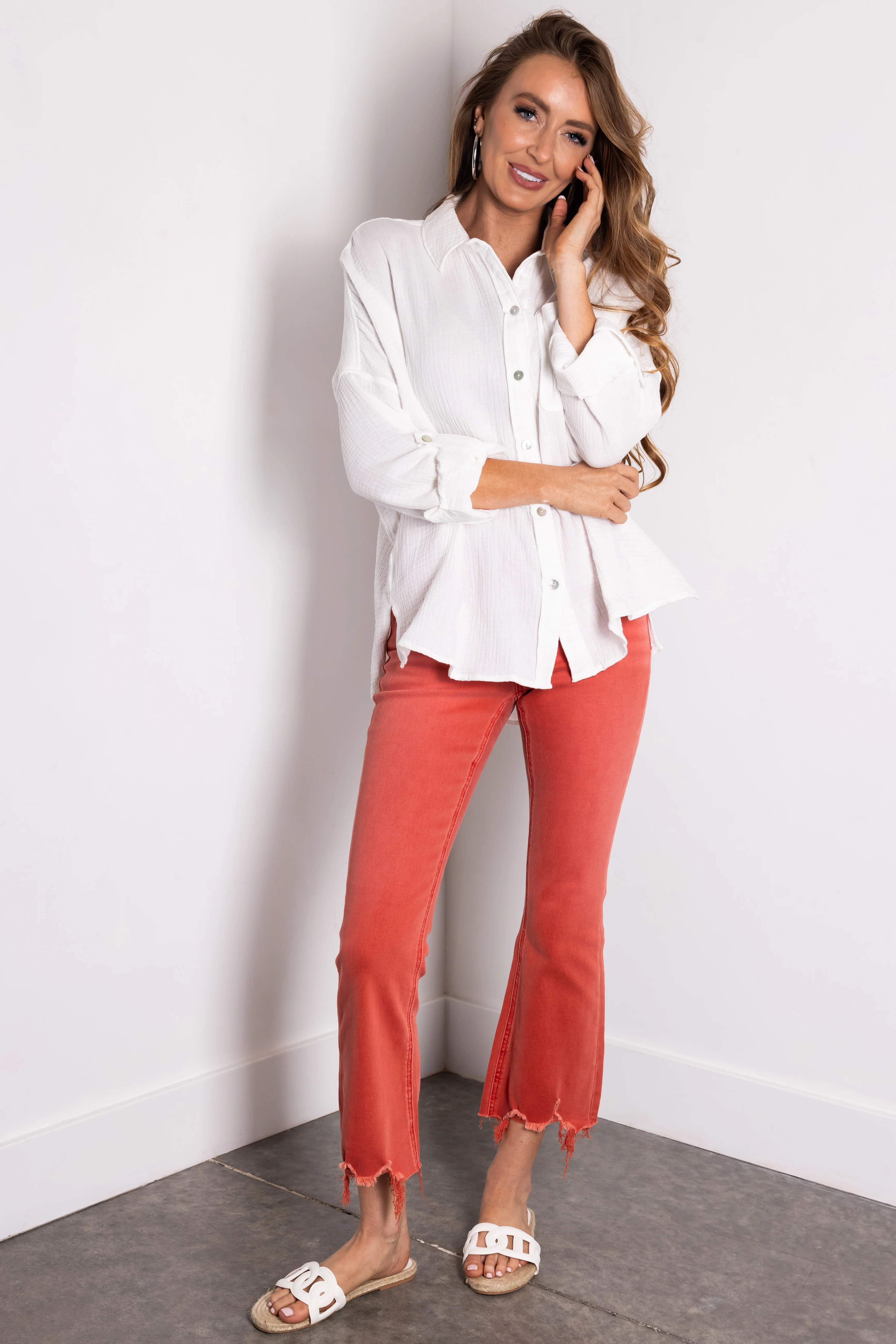 Off White Button Down Collared Long Sleeve Top