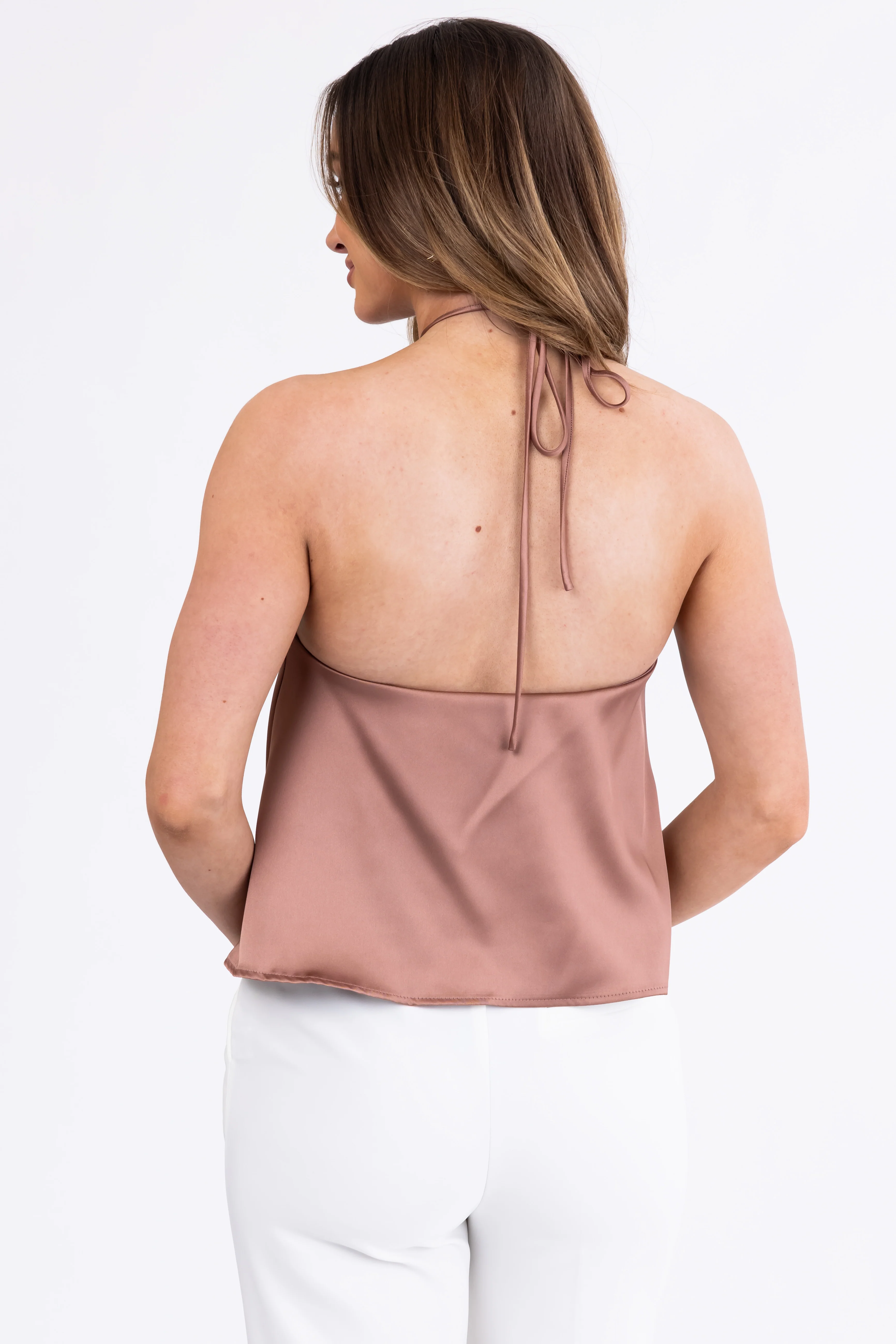 Dusty Rose Satin Halter Tank Top with Rose Accent